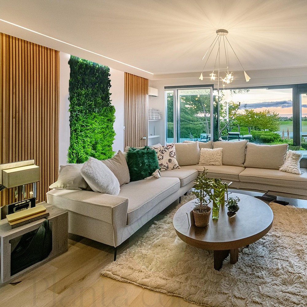 Jardín Vertical HELECHO MIXTO artificial, espectacular estética y acabado, válido para interior y exterior. Aspecto natural, fresco y realista. Puedes utilizarlo como base para crear tu propio diseño de jardín Vertical. Tiene protección contra los rayos del sol (UV) y contra la humedad, evitando así la pérdida de color. Está pensado para poder instalarlo fácilmente, adaptándose a las medidas que necesites, utilizando un cúter o unas tijeras puedes modificar sus medidas.