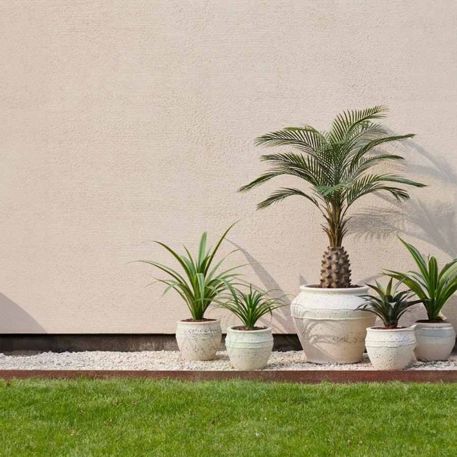 DRÁCENA artificial para exterior con TRATAMIENTO UV. Réplica de estética elegante con grandes hojas finas acabadas en punta. Una planta tropical espectacular para cualquier tipo de ambiente, con un alto nivel de realismo y no requiere ningún tipo de mantenimiento. Incluye macetero básico.